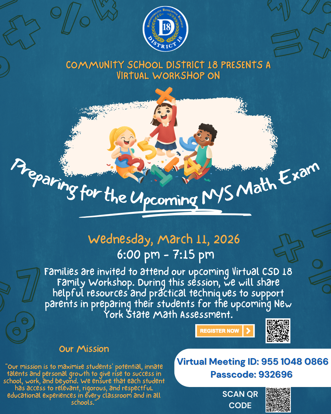 D18 families, you’re invite your school community to our virtual workshop, "Preparing for the Upcoming NYS Math Exam", on March 11th, 2026. This engaging workshop is a great opportunity for families to learn practical strategies, tools, and resources they can use right away to support their children’s success on the New York State Math Exam.